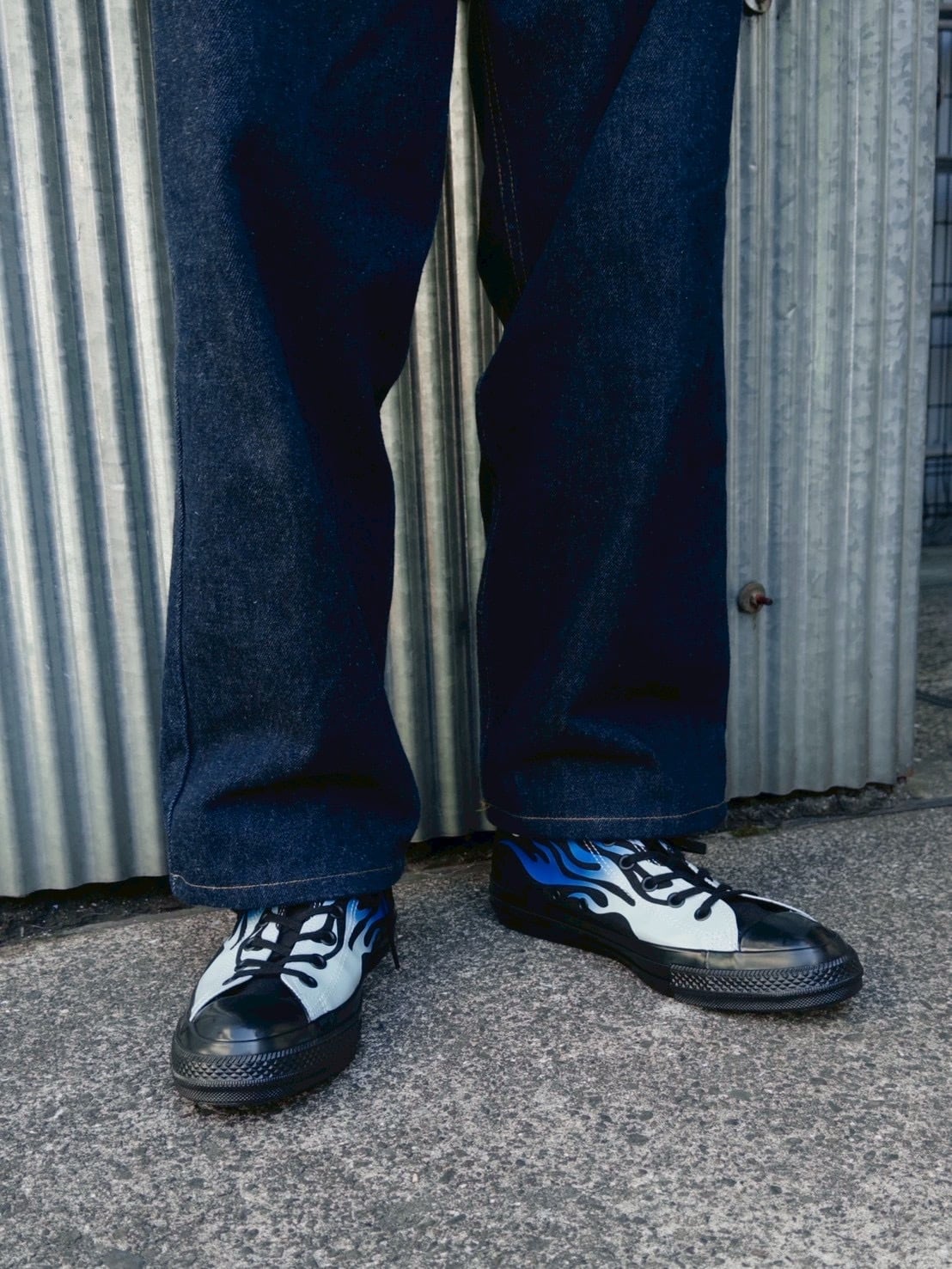 古き良きアメリカの車やバイクのカスタムカルチャーで用いられる、フレイムパターンをアッパーにプリント。